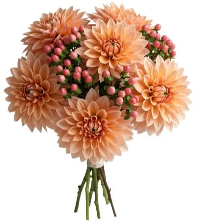 Introducing the vibrant Orange Dahlia Bouquet with Hypericum, a stunning arrangement that captures the essence of warmth and cheer with its bold colors and unique textures. Our Orange Dahlia Bouquet with Hypericum is a vibrant and elegant expression of joy and beauty. Perfect for celebrating special occasions or brightening someone's day, this arrangement is sure to leave a lasting impression with its captivating colors and sophisticated design.