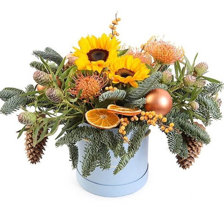 Stunning composition of blue roses and eucalyptus in a box. Unique way to send flowers by post.