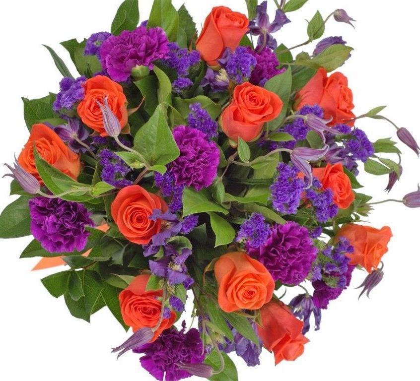 - Purple Carnations: add depth and texture, creating a luxurious contrast to the fiery orange roses. Their ruffled petals and vibrant hue offer a sense of sophistication and elegance.