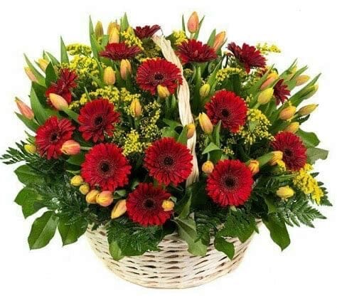 Brighten up any occasion with our Orange Tulips with Gerberas in the Basket, a stunning floral arrangement designed to bring joy and elegance to any setting. This beautifully curated basket features fresh orange tulips, complemented by vibrant gerberas blooms in a color of your choice, cheerful yellow solidago, and lush greenery, creating a warm and inviting display.