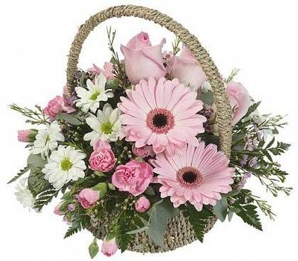 Unlike traditional vase arrangements, this basket offers a charming alternative, featuring a delightful mix of pink and white, balanced with delicate shades of green foliage. It’s a bright and pleasing arrangement that brings warmth and joy to any occasion.