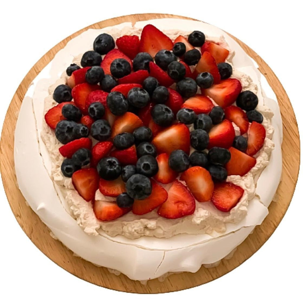 We offer delicious Pavlova sandwiched with mascarpone cinnamon cream, blueberries and strawberry. This Pavlova Cake has a smooth and cinnamon-cream filling. Topped with fresh strawberries and blueberries.