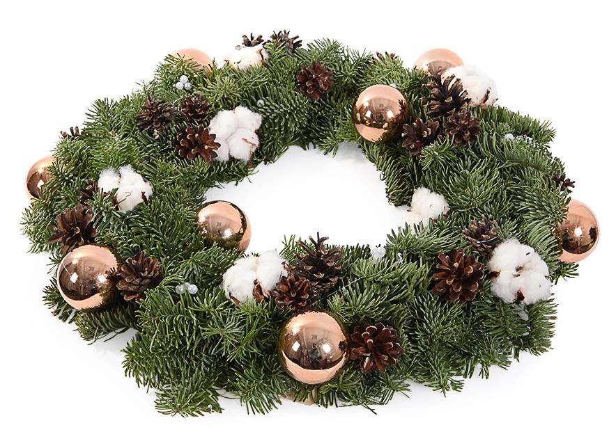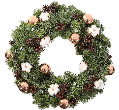 Rose Gold Baubles Christmas Door Wreath: Elegant Holiday Charm with Natural Cones, Cotton, and Fresh Spruce
