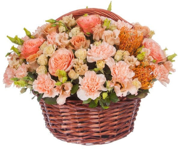 Delight in the warmth and charm of our Peach Exotic Basket, a stunning floral composition featuring soft peach garden roses flowers, classic peach roses, and striking orange leucospermum. Complemented by peach carnations, ivory lisianthus, and delicate ivory spray roses, this basket exudes elegance and beauty, making it the perfect gift for any occasion.
