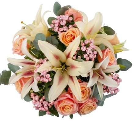 Delight in the gentle beauty of the Peach Muse Bouquet, a romantic and refined floral arrangement featuring blush pink lilies, peach roses, pink bouvardia, and fresh eucalyptus. This graceful bouquet brings together soft, feminine tones with natural greenery for a timeless and elegant gift. The Peach Muse Bouquet combines blush pink lilies, peach roses, pink bouvardia, and eucalyptus for a soft, elegant floral arrangement perfect for birthdays, anniversaries, weddings, and romantic gifts. Handcrafted with fresh flowers and designed to impress, this peach-toned bouquet offers timeless beauty for any occasion.