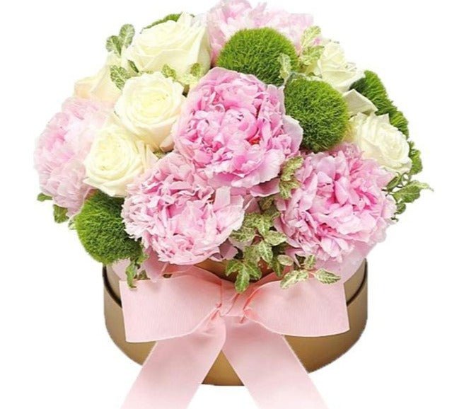 Gift elegance with our Peony and White Roses Hat Box. A stunning blend of soft peonies and pure white roses, arranged in a stylish hat box. Perfect for birthdays, anniversaries, or special celebrations.
