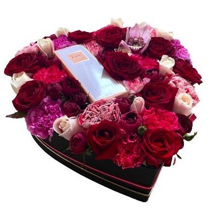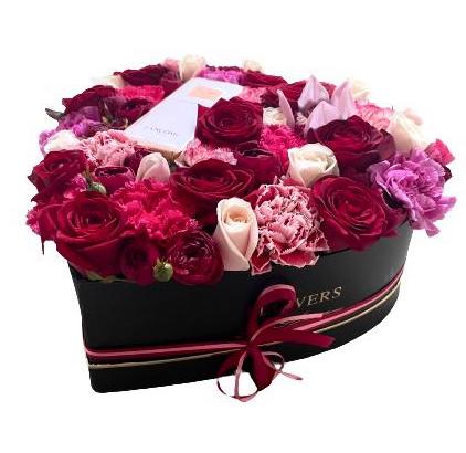 Discover the perfect gift for your loved one with our luxurious Perfume in Flowers Heart Box. This exquisite composition features a stunning mix of pink roses, red roses, ivory roses, pink carnations, and pink cymbidium orchids blooms, beautifully arranged to create a lasting impression. The addition of a hidden perfume in the heart of the box adds a personal and elegant touch.