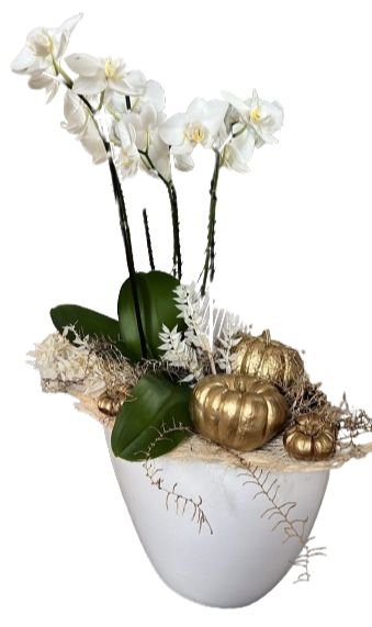 Our Phalaenopsis Orchids Luxury Gift with Gold Pumpkin is a truly sophisticated and stylish arrangement, perfect for those who appreciate timeless elegance with a modern twist. Featuring graceful phalaenopsis orchids paired with a decorative gold pumpkin, this luxury design makes an unforgettable gift for special occasions, seasonal celebrations, or elegant home décor. This luxury piece is perfect for autumn celebrations, festive gifting, anniversaries, or corporate presents, offering both elegance and a touch of creative flair.