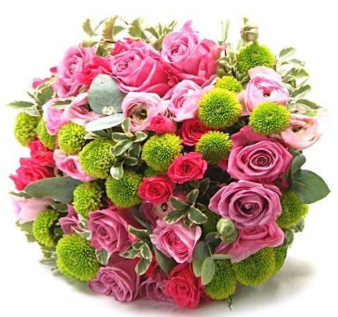 - Green Santini Chrysanthemum: provides a fresh green accent and adds a contrasting color to the predominantly pink bouquet.