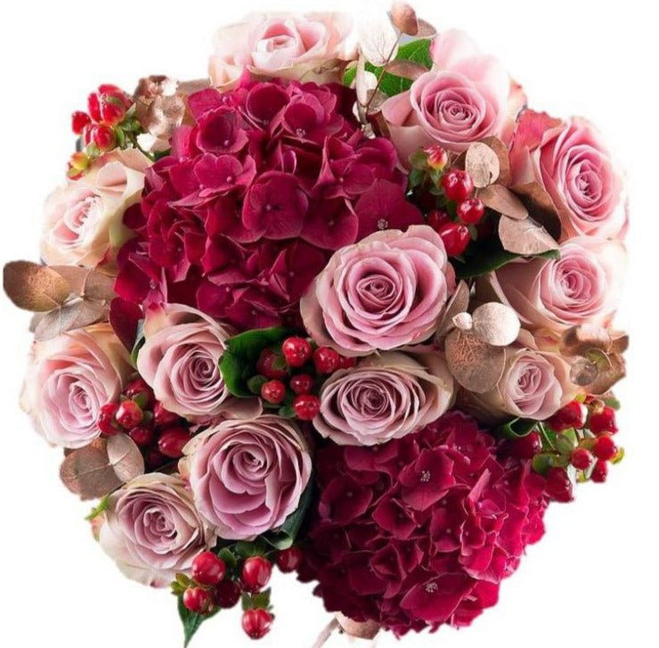 Introducing our stunning Pink and Cherry Bouquet, a captivating arrangement that combines the lush beauty of dark pink hydrangeas blooms with the classic elegance of pink roses and the vibrant touch of red hypericum.