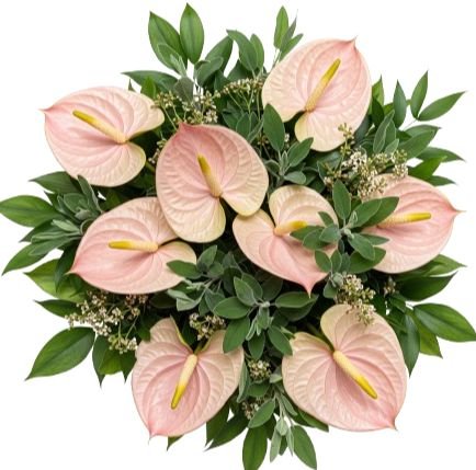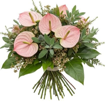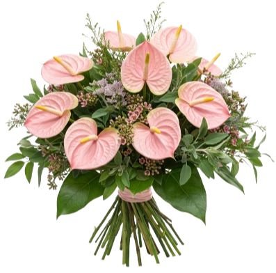- Pink Anthurium: with its glossy, heart-shaped petals, is a true symbol of hospitality, love, and admiration. Its vibrant hue adds a contemporary flair, making this bouquet stand out in any setting.
