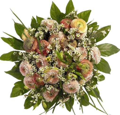 Introducing the Pink Bliss Bouquet, a stunning floral arrangement that combines the beauty of salmon ranunculus, pink santini chrysanthemums, white alstroemeria, delicate wax flowers, and lush greenery. This bouquet is a perfect embodiment of joy and elegance, making it an ideal gift for any occasion during autumn season. Whether you’re celebrating a birthday, expressing friendship, or showing support, the Pink Bliss Bouquet is a versatile choice that conveys warmth and appreciation. The harmonious blend of salmon, pink, and white blooms, paired with vibrant greenery, creates a visually striking centerpiece that brightens any space.