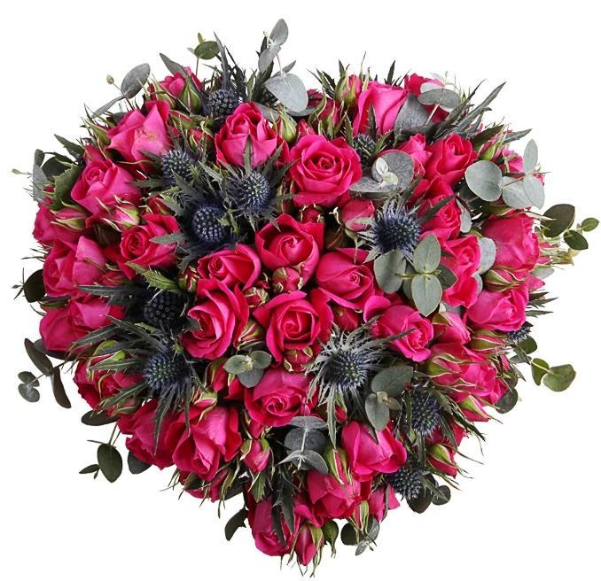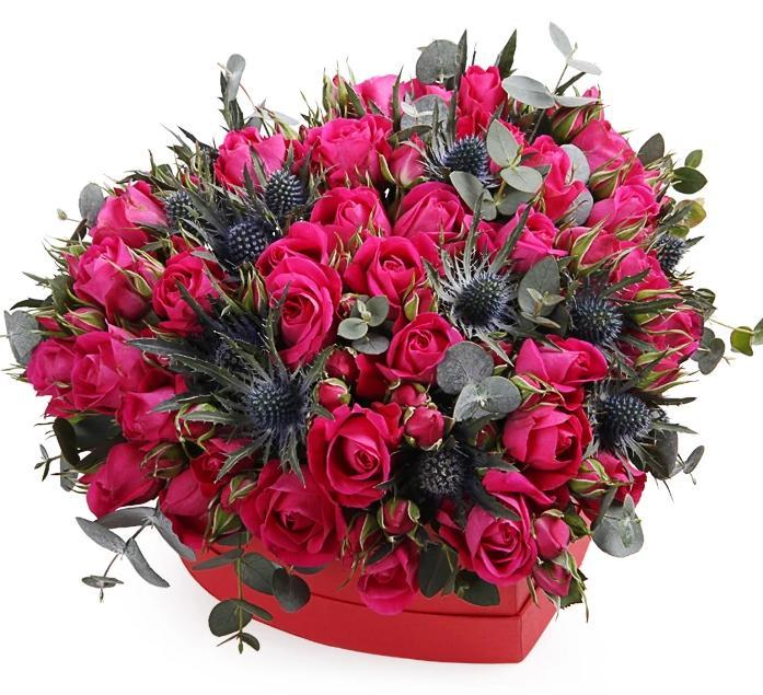 Add a touch of elegance and charm to your special moments with the Pink Chic Heart Box, a stunning floral arrangement beautifully presented in a heart-shaped box. Featuring vivid cerise spray roses, blue eryngium, and lush eucalyptus, this arrangement is perfect for expressing love, gratitude, or celebration.