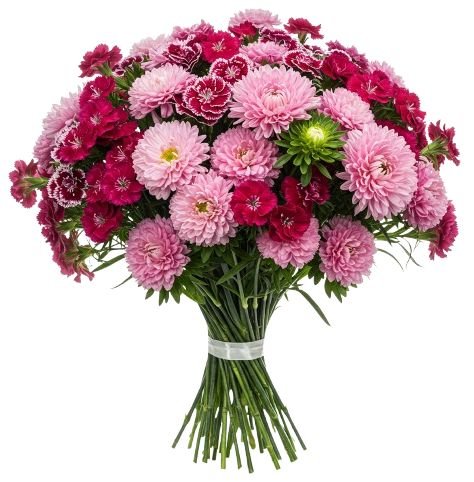 The pink chinese asters, with their layered petals and soft romantic hue, symbolize elegance, love, and patience. Their gentle presence is beautifully balanced by the cheerful Sweet Williams, which bring splashes of bright color and a delightful fragrance, symbolizing admiration, friendship, and gratitude. Together, these flowers create a bouquet that feels fresh, lively, and full of heartfelt sentiment.