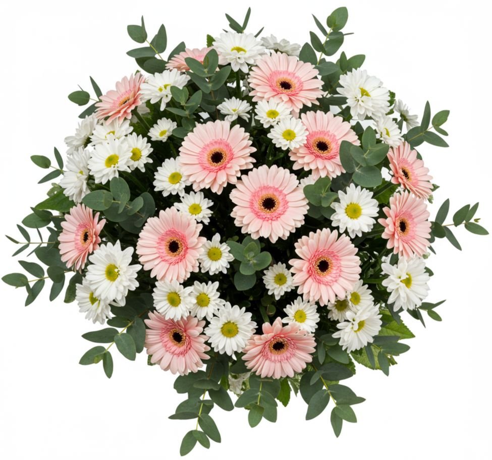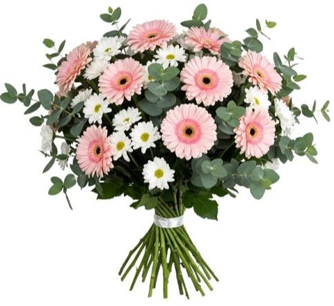 Designed to uplift and delight, this bouquet brings together timeless floral elements with a modern twist. The daisies symbolize purity and positivity, while the pink gerberas add a touch of romance, energy, and happiness. Accents of aromatic eucalyptus introduce a fresh, calming essence that enhances the overall beauty of the arrangement. Whether you're marking a birthday, anniversary, housewarming, or sending a thoughtful surprise “just because,” this bouquet delivers both color and emotion. Its versatile style makes it ideal for both casual gifting and special occasions.