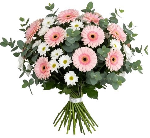 - Pink Gerberas: represent admiration, sweetness, and joy. Their bold, daisy-like blooms add structure and vibrancy to the arrangement while maintaining a soft, feminine tone. They beautifully complement the daisy chrysanthemums, enhancing the bouquet's brightness and appeal.