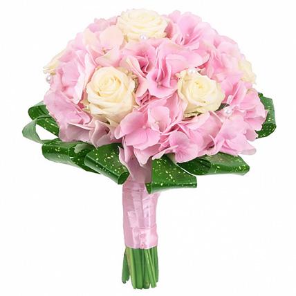 Every bride wants her bouquet to match her wedding dress - after all, the bride is in the first place during the wedding. This bright bouquet of hydrangeas flowers goes beautifully with any bride's dress! Hydrangea is one of the most popular flowers for wedding bouquets, and pink roses add charm to the whole composition!