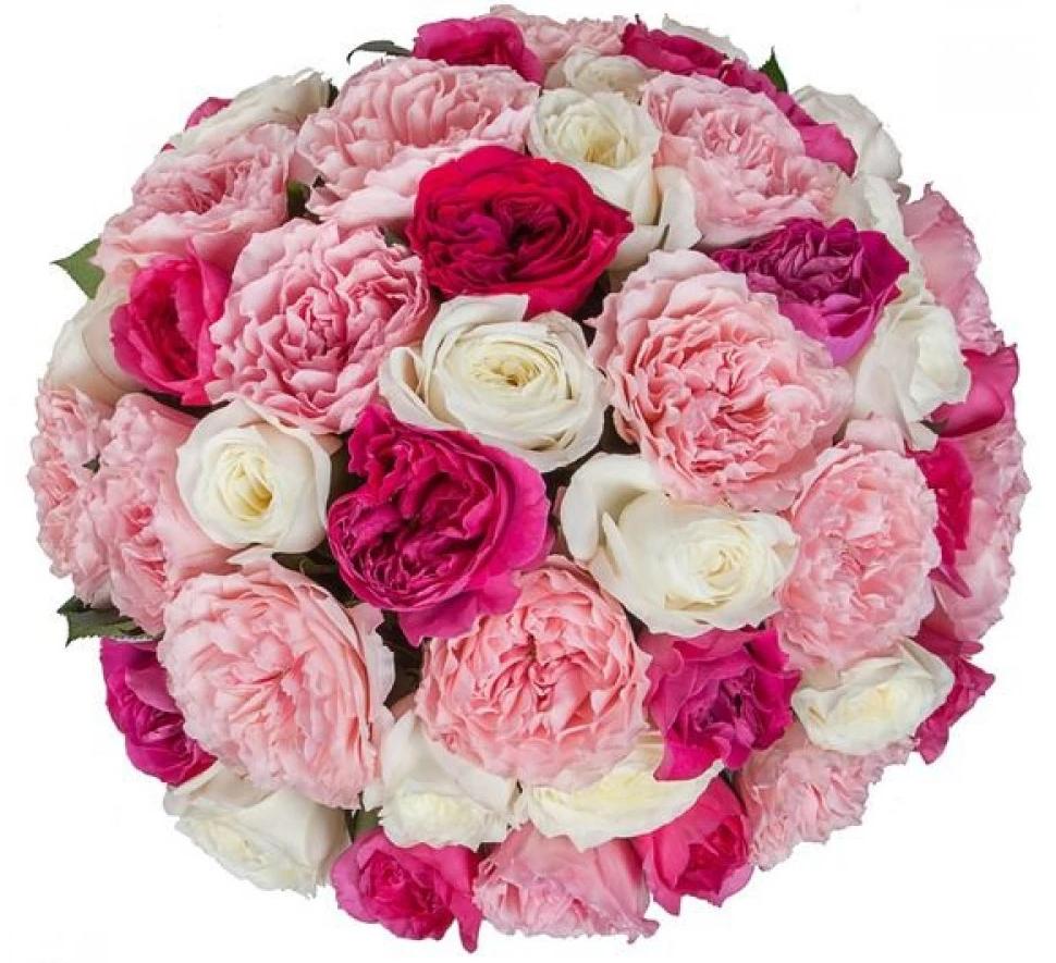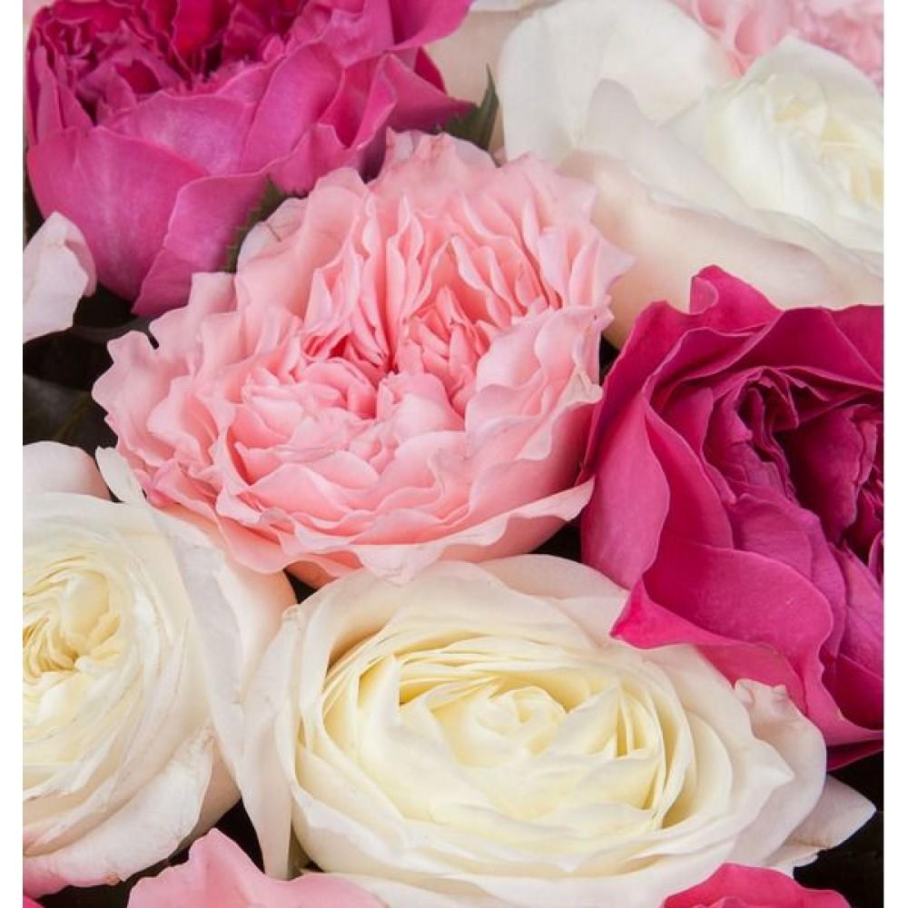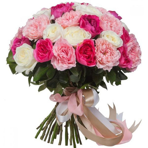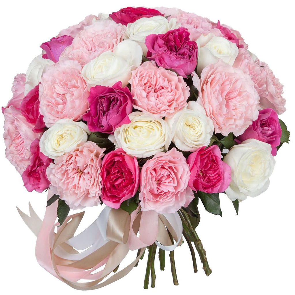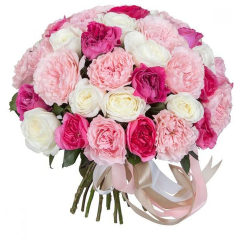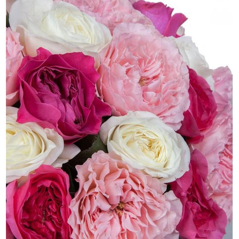 Elevate any occasion with the exquisite beauty of a Pink Palette Garden Roses Bouquet. This stunning arrangement features a harmonious blend of fragrant garden roses in shades of soft pink, cerise, and white, creating a perfect balance of elegance and charm.