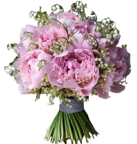 - Lily of the Valley: known for its sweet fragrance and dainty bell-shaped flowers, Lily of the Valley symbolizes purity, happiness, and renewal. These delicate blooms add a whimsical touch to the bouquet, enhancing its overall charm and allure. Their subtle white hue complements the soft pink peonies beautifully, creating a harmonious blend of colors and textures.