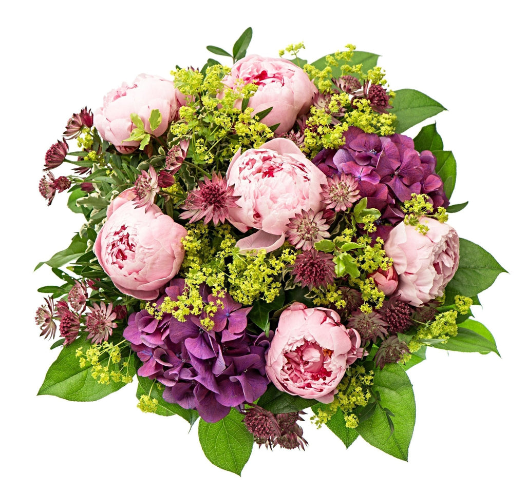 At the heart of the bouquet are the magnificent pink peonies, known for their large, ruffled petals and intoxicating fragrance. These blooms symbolize romance and prosperity, making them a perfect choice for weddings or special celebrations. Surrounding the peonies are clusters of hydrangea blossoms in varying shades of pink and purple. These fluffy blooms add volume and texture to the arrangement, creating a sense of abundance and opulence.