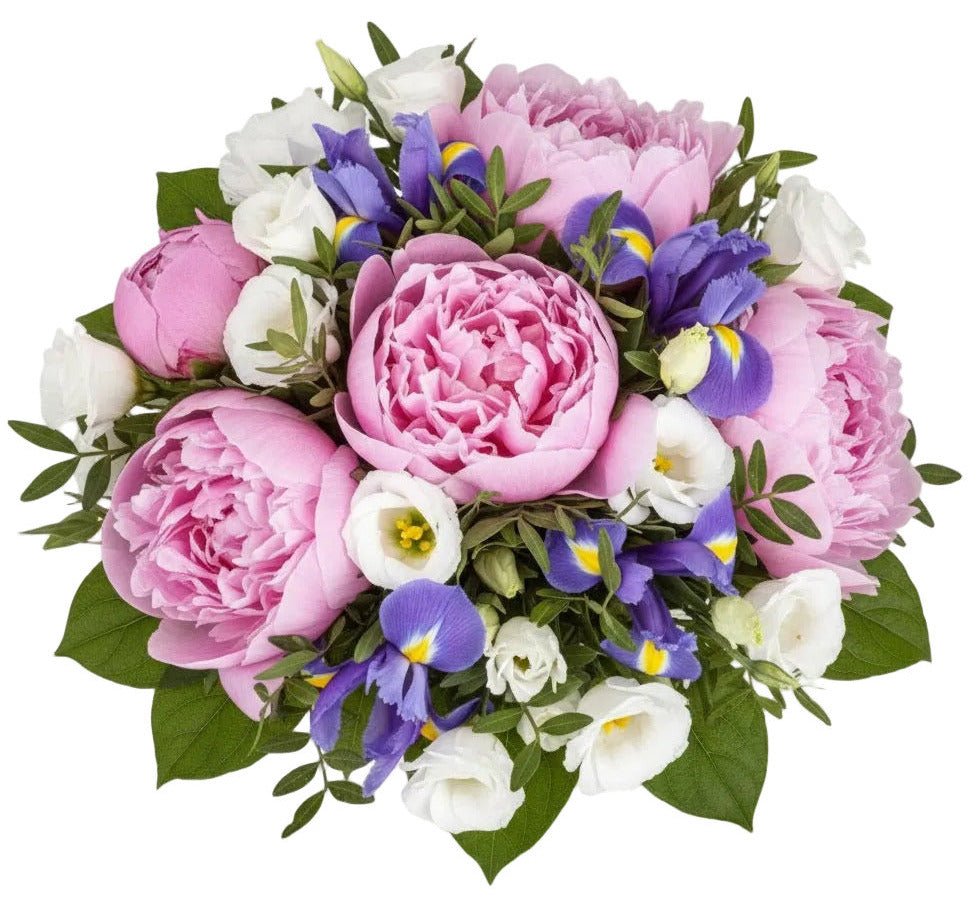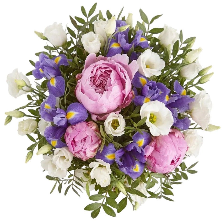 A Pink Peony in Purple Bouquet is a stunning floral arrangement that combines the soft and romantic beauty of pink peonies with the striking contrast of blue iris and the purity of white lisianthus. The bouquet features a harmonious combination of soft pink, deep purple-blue, and pure white. This color palette blends the romantic allure of pink with the regal beauty of purple-blue and the elegance of white, creating a visually striking and balanced composition.
