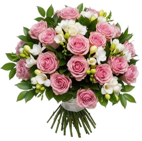 Delight in the soft elegance of our Pink Roses and Freesias Bouquet, a charming arrangement that combines delicate blooms and fresh greenery for a romantic, fragrant touch. This bouquet combines the romantic elegance of pink roses with the delicate fragrance and charm of freesias. Pink roses symbolize admiration, gratitude, and joy, while freesias add a light, sweet scent and a graceful, airy texture. Often accented with green foliage like fresh eucalyptus or ruscus, this bouquet creates a soft, feminine, and sophisticated arrangement — perfect for birthdays, anniversaries, or expressing affection.