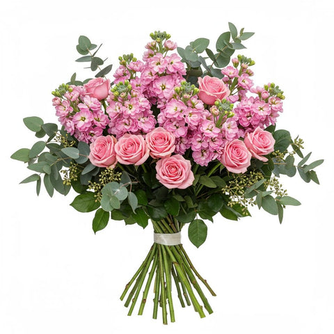 Soft Pink Roses & Stocks – Classic Bouquet with Lush Greens