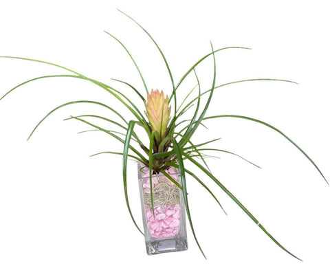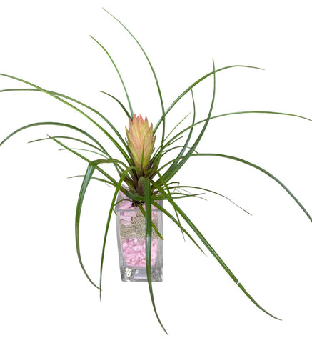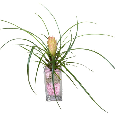 Each arrangement is carefully curated to highlight the delicate beauty of the pink Tillandsia, offering a unique and stylish alternative to traditional potted plants. No soil needed — just light and occasional misting. Ideal for home décor, office spaces, or modern gifting, this elegant glass tank arrangement brings life to any environment with ease and charm.