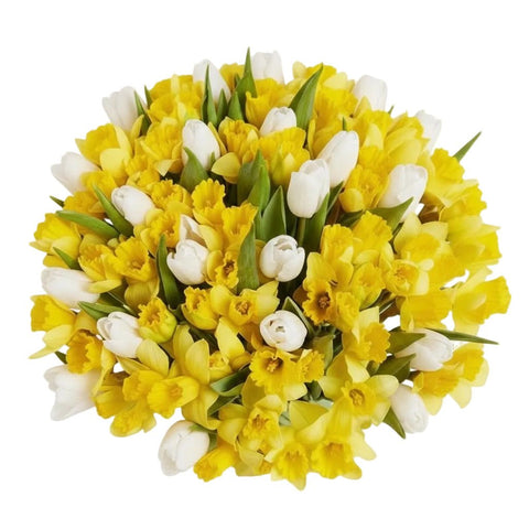 - Tulips (Color to Choose From): choose your favorite tulip color to complement the daffodils. Whether it's classic red, soft pink, cheerful yellow, or elegant white, tulips add a refined elegance and timeless beauty to the bouquet. Their graceful petals and gentle curves perfectly enhance the fresh vibrancy of the daffodils.