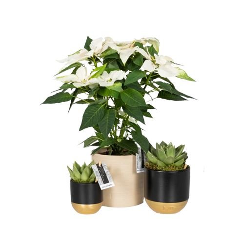 At Flowers Box London, we specialize in delivering exquisite floral gifts throughout the UK with next-day delivery options. All our plants are carefully crafted by our skilled florists, ensuring each arrangement is a unique masterpiece. Add holiday cheer with the Poinsettia and Succulent Set in a ceramic pot. Featuring a beautiful Poinsettia plant and two assorted succulents, this arrangement is a perfect blend of festive tradition and modern style.