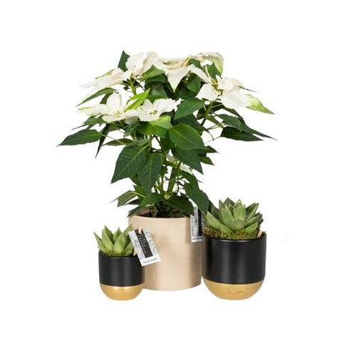 The Poinsettia and Succulent Set in a Ceramic Pot is a charming and festive plant arrangement that adds a touch of nature to your holiday decor. Perfect for creating a welcoming atmosphere during the Christmas season or as a beautiful gift, this set features a stunning Poinsettia Plant alongside two vibrant Succulent Plants, all nestled in an elegant ceramic pot.