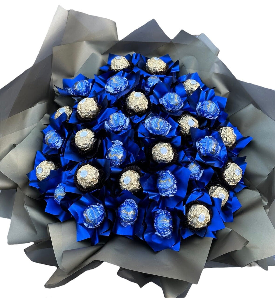 You can select the type of chocolate to customize the bouquet according to your preference or the recipient's taste. The rich, velvety flavors of the chocolates, wrapped in elegant blue and gold wrappers, create a sophisticated and indulgent gift.