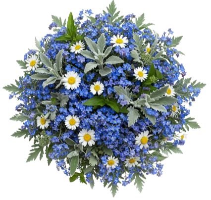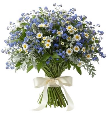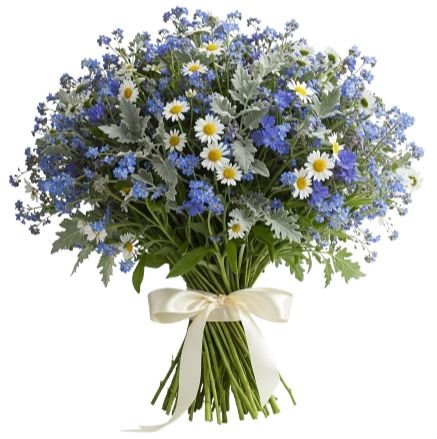 - Blue Forget-Me-Nots: tiny yet captivating, these dainty blue flowers carry deep meaning, symbolizing true love, remembrance, and loyalty. They add a soft splash of blue that perfectly complements the daisies.
