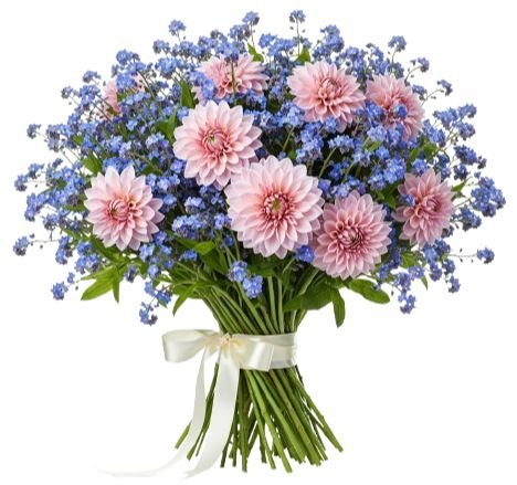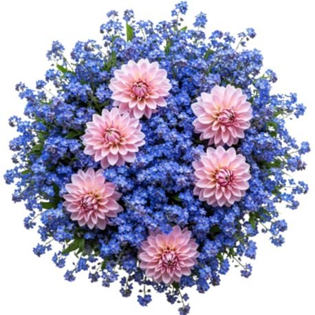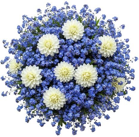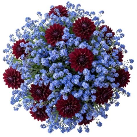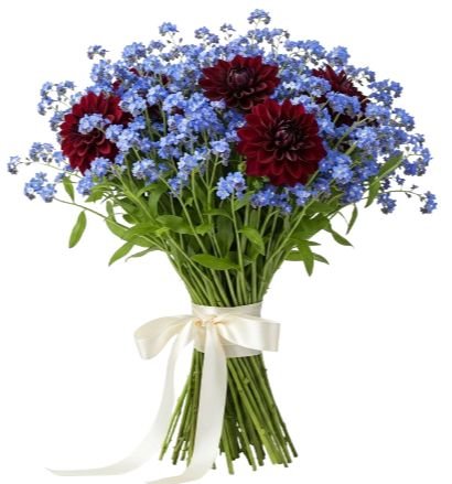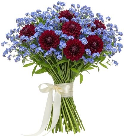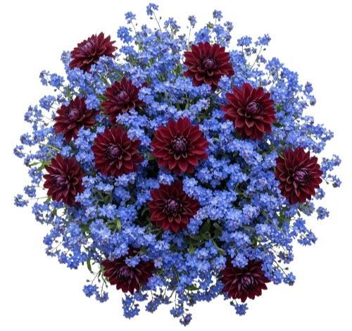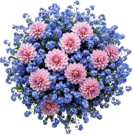 - Dahlia (colour to choose from): available in a stunning range of shades — from soft pinks and romantic reds to elegant whites, vibrant oranges, or rich purples. Dahlias symbolize strength, grace, and lasting commitment, making them a versatile flower that beautifully complements the tender forget-me-not.