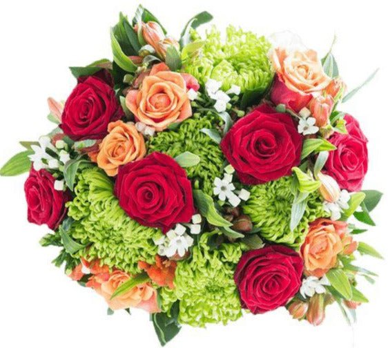 Introducing the Promise Bouquet – a stunning blend of vibrant colors and lush greenery that exudes elegance and passion. This bouquet combines the timeless allure of red roses with the warmth of orange roses and the delicate charm of orange alstroemeria. Adding a refreshing contrast, green anastasia chrysanthemums and pure white bouvardia elevate the arrangement, while rich greenery ties everything together for a lush and full-bodied finish.