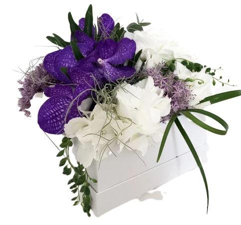 Purple and White Vanda Orchids Signature Box – Exquisite Orchid Arrangement