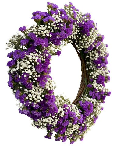 Elevate your home decor with our stunning Purple Limonium and White Gypsophila Wreath, a perfect blend of soft purple and white blooms. The delicate Purple Limonium flowers add a touch of elegance, while the White Gypsophila (baby's breath) brings an airy, romantic charm. This wreath is ideal for year-round use, whether you're looking to enhance your entryway, brighten up an interior wall, or add a beautiful accent to your seasonal decorations.