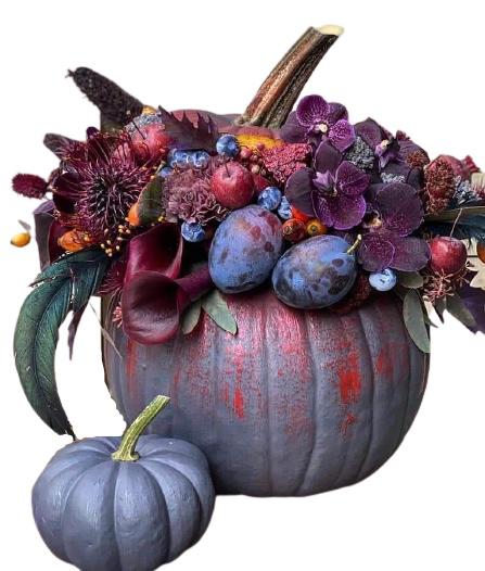 Each arrangement features carefully selected gourds and blossoms in rich fall tones, making it an ideal gift for loved ones or a lovely addition to your festive decor. Introducing our Purple Pumpkin with Plum Arrangement, a luxurious and striking centerpiece that beautifully blends rich colors and textures. This stunning display combines elegant blooms with seasonal elements, making it perfect for fall celebrations, halloween gatherings, or as a unique gift for floral enthusiasts.