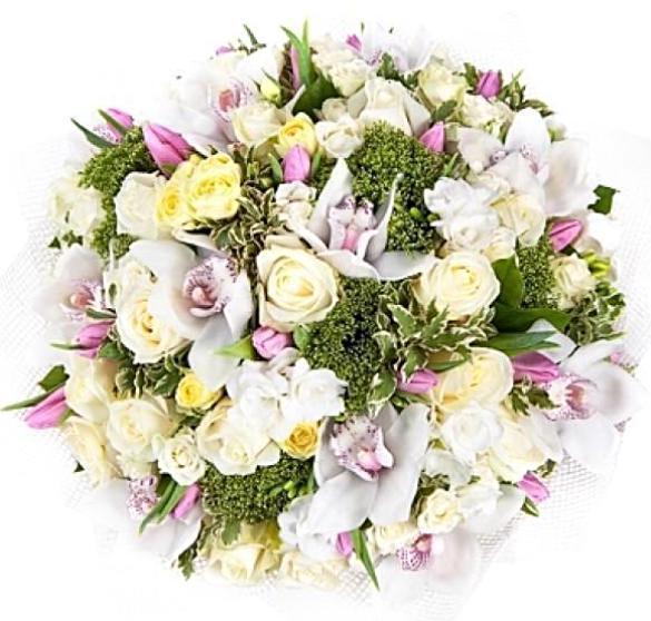 The Quartz Bouquet is a sophisticated floral arrangement that embodies grace, purity, and natural beauty. Featuring an elegant blend of White Cymbidium Orchids, White Roses, Ivory Spray Roses, Pink Tulips, White Trachelium, and lush greenery, this bouquet is the perfect expression of refined taste and timeless charm.
