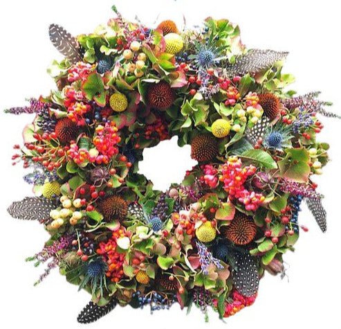- Blue Eryngium: adds a unique and striking element to the wreath, contributing a rich blue hue that contrasts beautifully with the warm autumn shades.