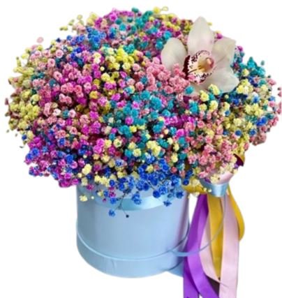 Perfect for anniversaries, celebrations, or as a thoughtful gift to brighten someone's day, the Rainbow Gypsophila Box with Cymbidium Orchids Accent delivers an unforgettable visual experience. The vibrant colors and sophisticated orchids will delight and captivate the recipient, adding a touch of charm and joy to any occasion.