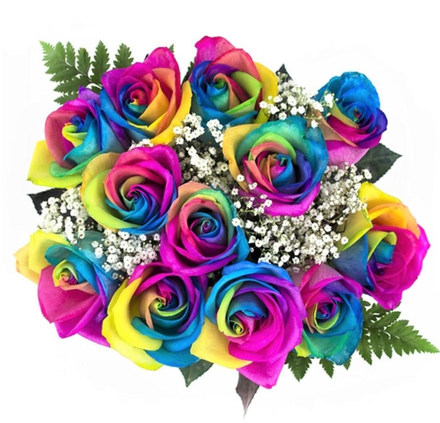 Order now to bring joy and color to someone's special day with our beautiful Rainbow Roses with Gypsophila Bouquet.