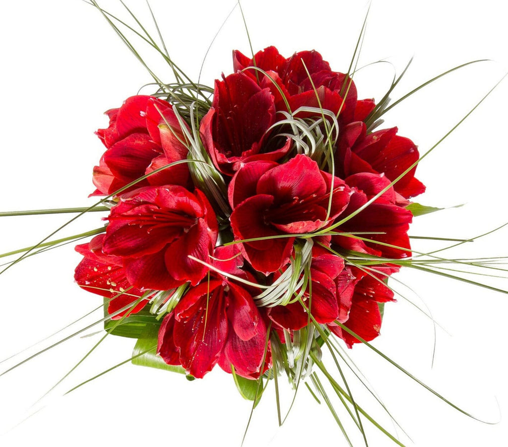 - bear Grass: adding movement, texture, and a contemporary flair. The slender, arching leaves of bear grass provide a soft, natural contrast to the boldness of the amaryllis, enhancing the bouquet’s overall structure and visual appeal.