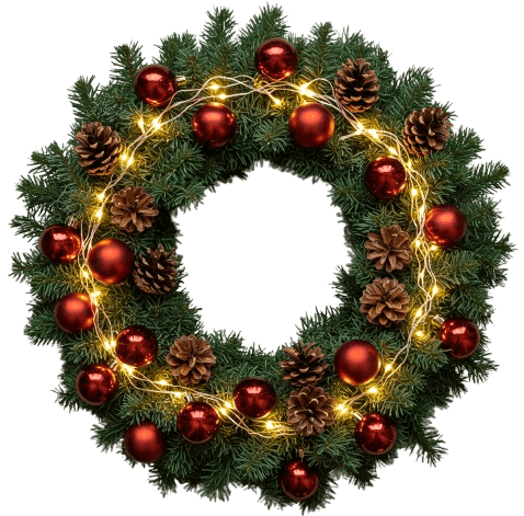 - Red Assorted Baubles: A variety of red baubles in different sizes and finishes adds a festive and dynamic look to the wreath. Their glossy and matte textures create visual interest, while their bright, rich color radiates holiday cheer.