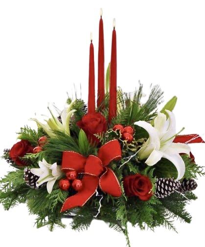 The Red and White Christmas Centerpiece is a stunning and festive arrangement that beautifully captures the spirit of the holiday season. This centerpiece combines elegant flowers with natural elements, creating a warm and inviting display.