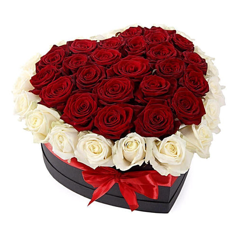 Make any occasion truly special with our Red and White Roses in a Box. This stunning arrangement combines the classic beauty of red roses symbolizing love and passion with the purity and elegance of white roses, creating a perfect harmony.