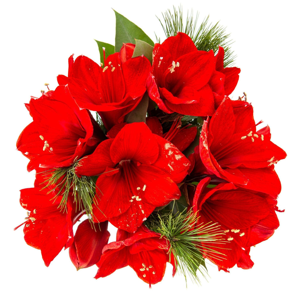 - Red Amaryllis: the star of the bouquet, these striking red blooms exude elegance and passion, creating a dramatic and bold centerpiece.