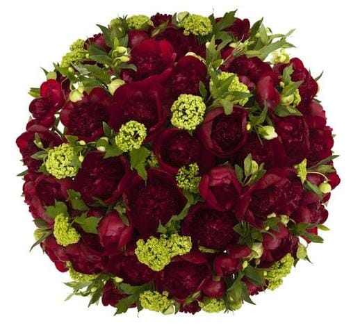 - Green Viburnum: the round, green viburnum blooms bring a fresh, natural element to the arrangement. Their subtle texture and soft green hue create a perfect balance with the vibrant red peonies.