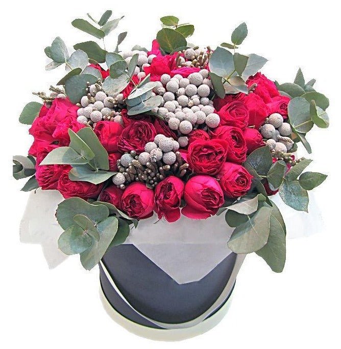 Make a lasting impression with the Red Perfection Box, a striking arrangement that combines the fiery beauty of Red Trendsetter Spray Roses with the unique texture of silver brunia and the refreshing touch of eucalyptus. This luxurious flowers box is perfect for romantic gestures, special celebrations, or adding a sophisticated flair to any setting.