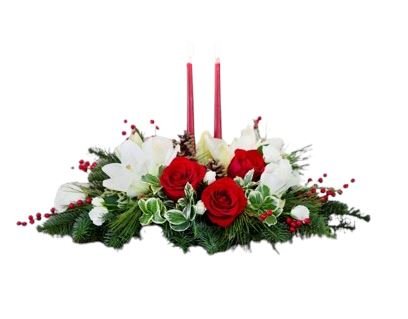 Add a touch of sophistication to your table with our Red Roses and White Tulips Centerpiece. This beautiful floral arrangement features vibrant red roses paired with graceful white tulips, creating a striking contrast that captures attention.